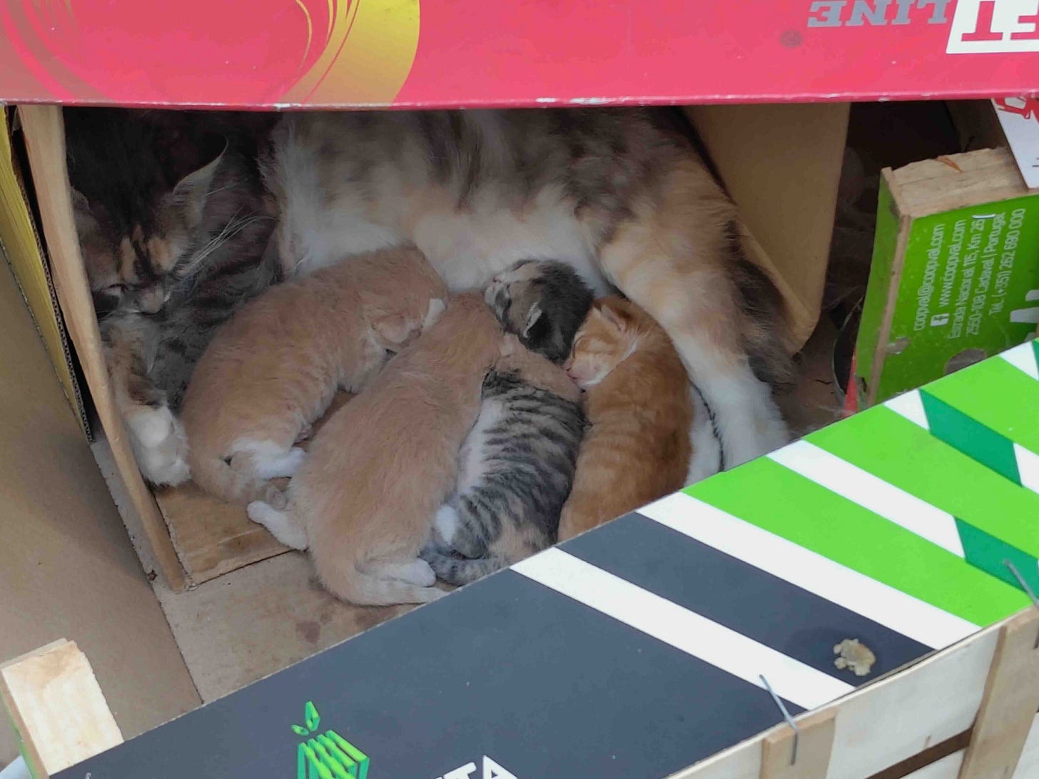 The next morning we headed down to the market, passing the cardboard box where a mummy-cat was nursing her litter
